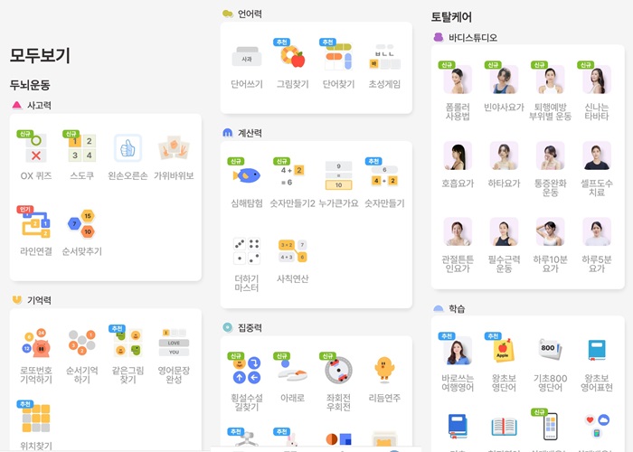요가와 근력 운동 등 뇌 뿐만이 아닌 건강 분야도 함께 포함되어 있었고 특히 어른들에게 어려운 키오스크 사용 방식도 학습 카테고리에 있어 어른들의 건강과 생활에 대해 큰 배려를 보여주고 있는 데카르트였다.