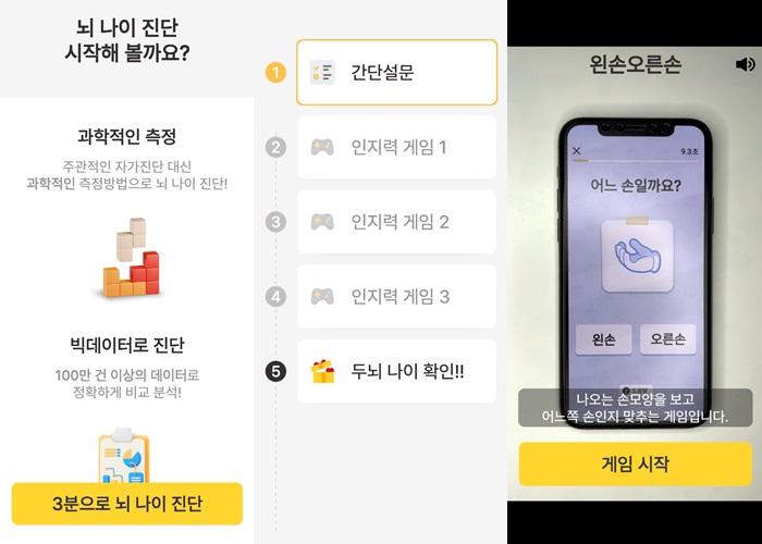 그다음으로 자신의 뇌에 나이를 측정할 수 있는 3분 자가진단이 나타날 것이고 뇌 나이를 측정할 수 있다는 이야기에 보다 집중력을 쏟아서 테스트를 시작하게 된다.